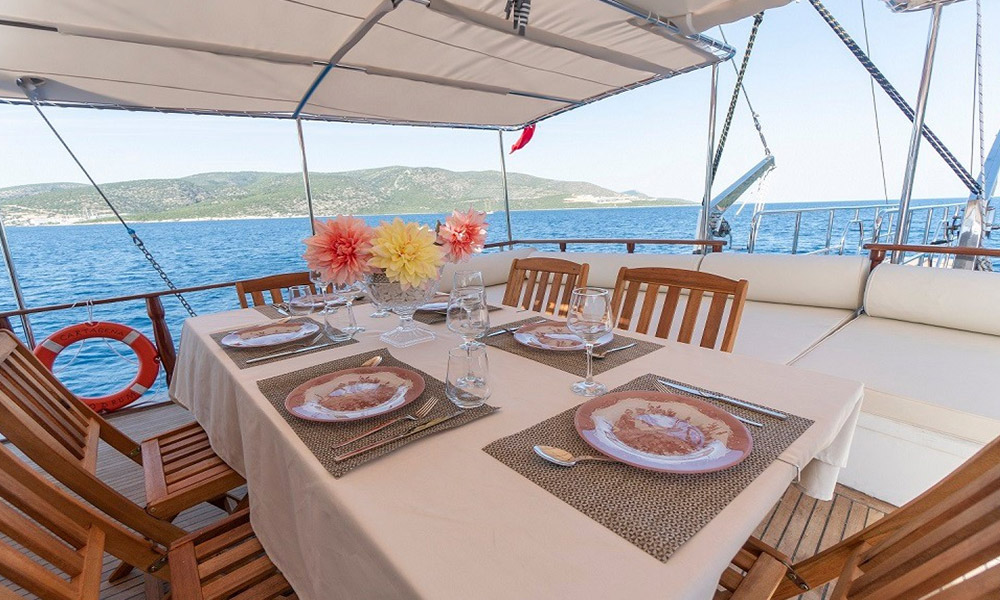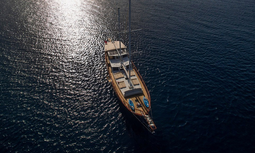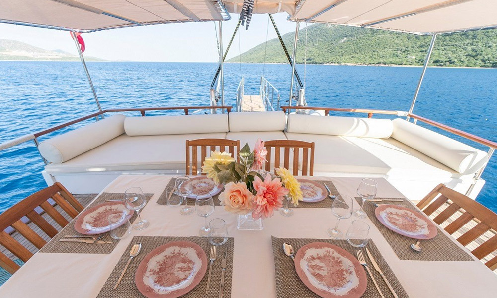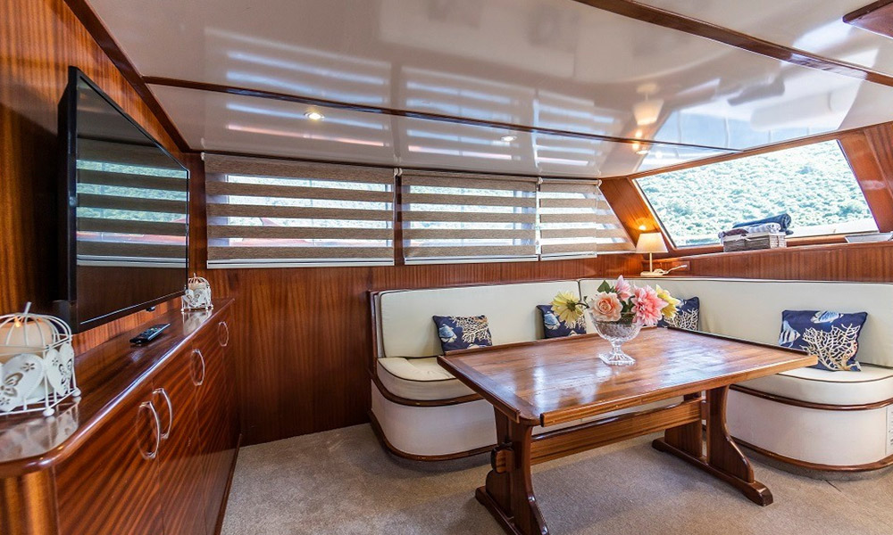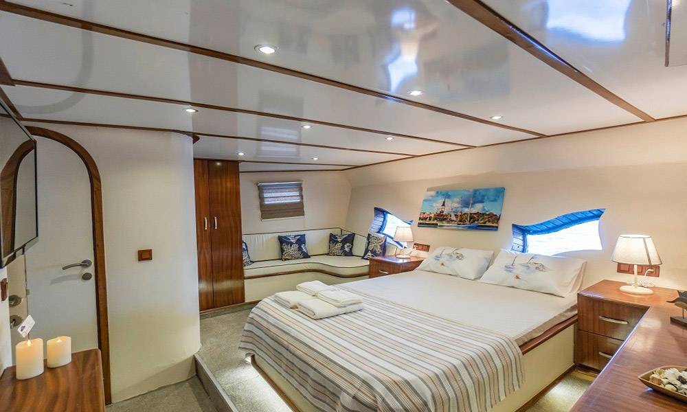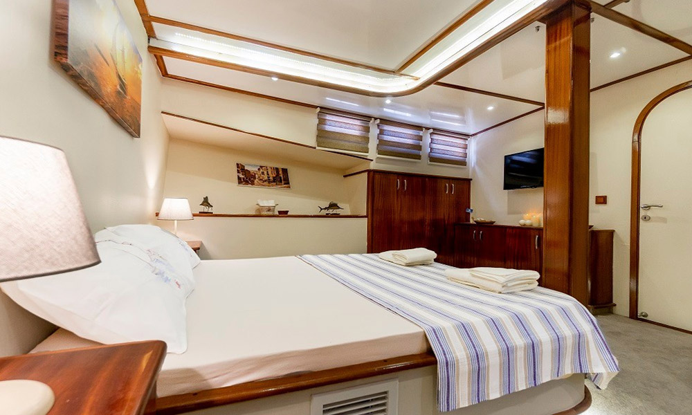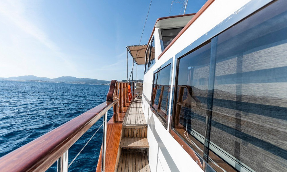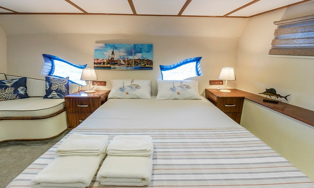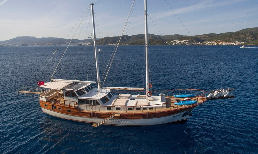 Cartagena is a 24 m, premium-class gulet departing from Bodrum. Refitted in 2019, she hosts up to 8 guests in four air-conditioned cabins (2 master, 2 double). With a 6.8 m beam, interiors feel calm and practical, and the salon includes a TV/Plasma and an ice machine. A 380 HP CAT engine keeps cruising steady. On deck you’ll find shaded dining and sunpads; a tender/dinghy is ready for shore runs. For simple fun on the water there’s a kayak, snorkelling and light fishing gear, plus board games for quiet evenings. Cartagena suits families or small groups looking for a clean, comfortable boat and an easygoing cruise among Bodrum’s bays.
