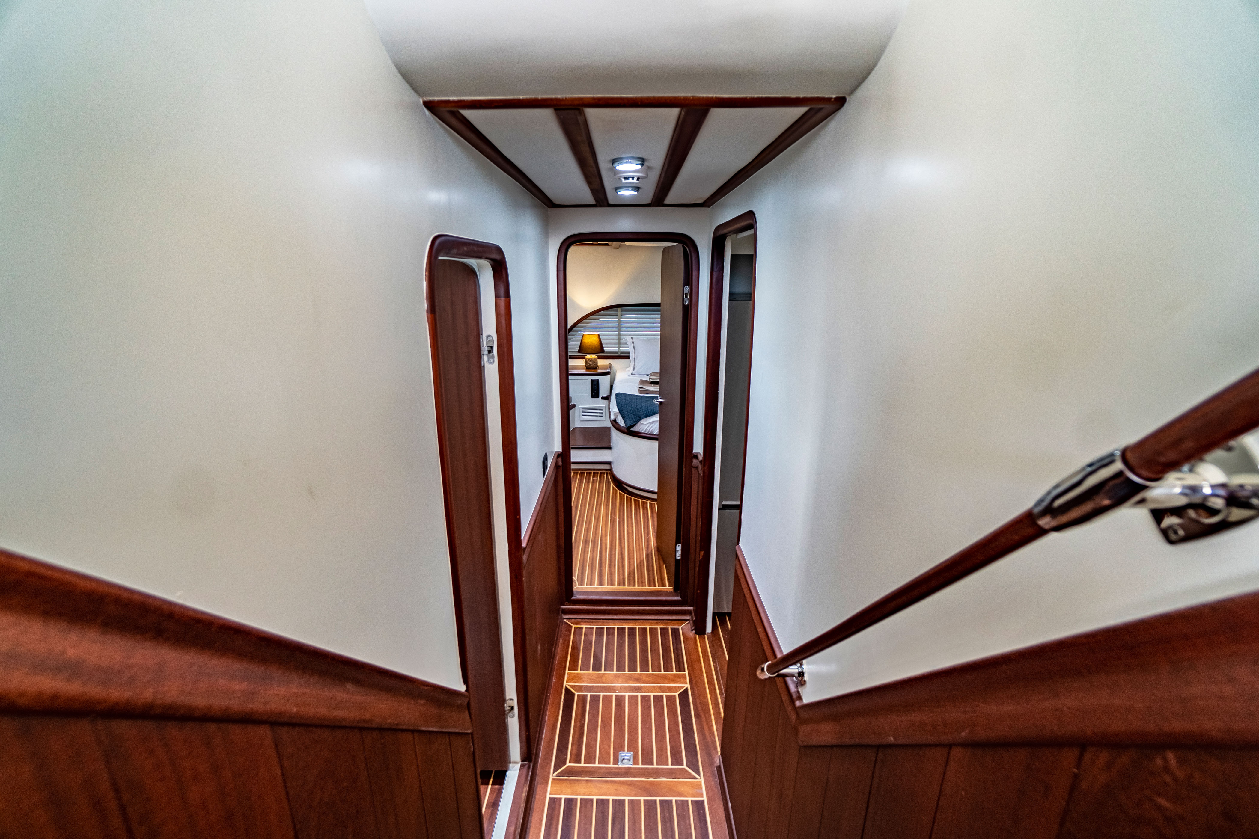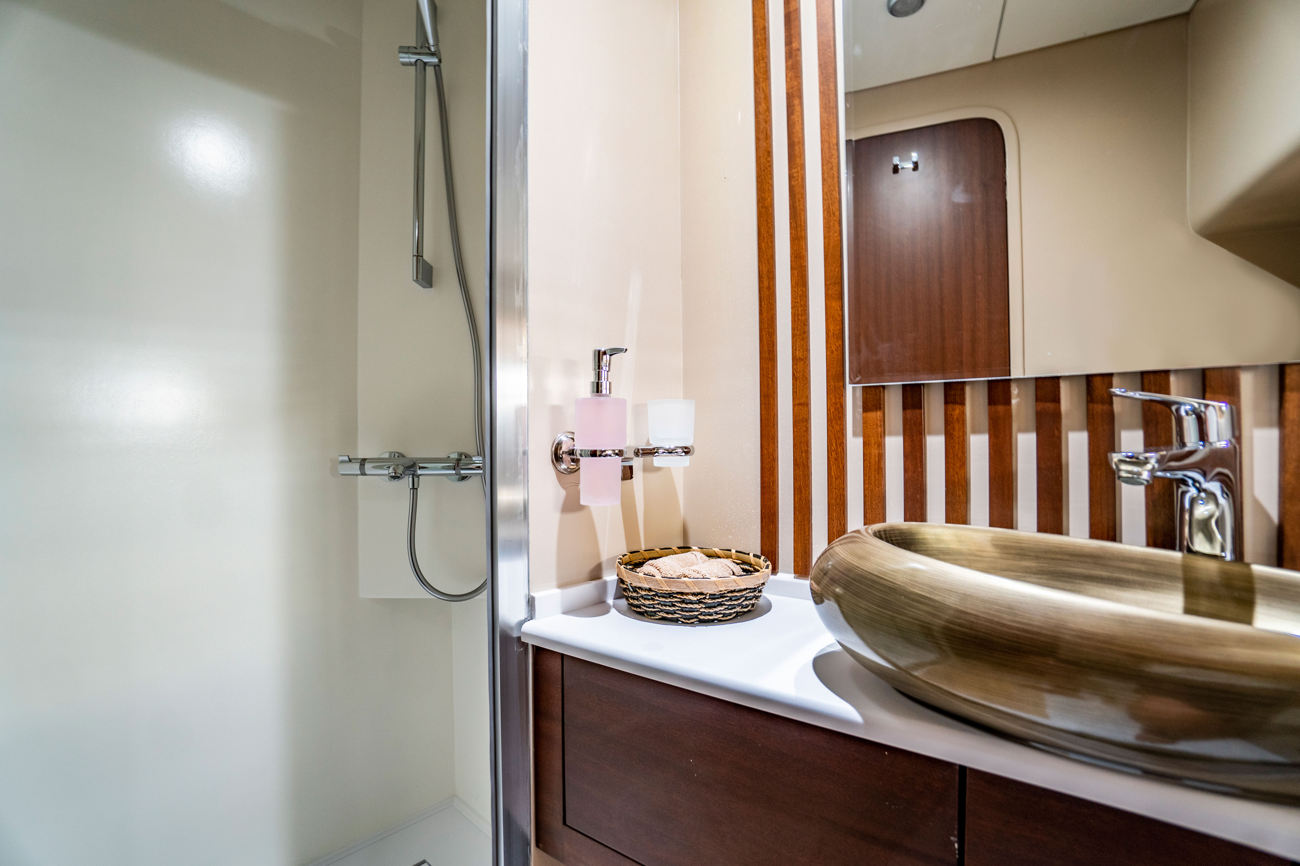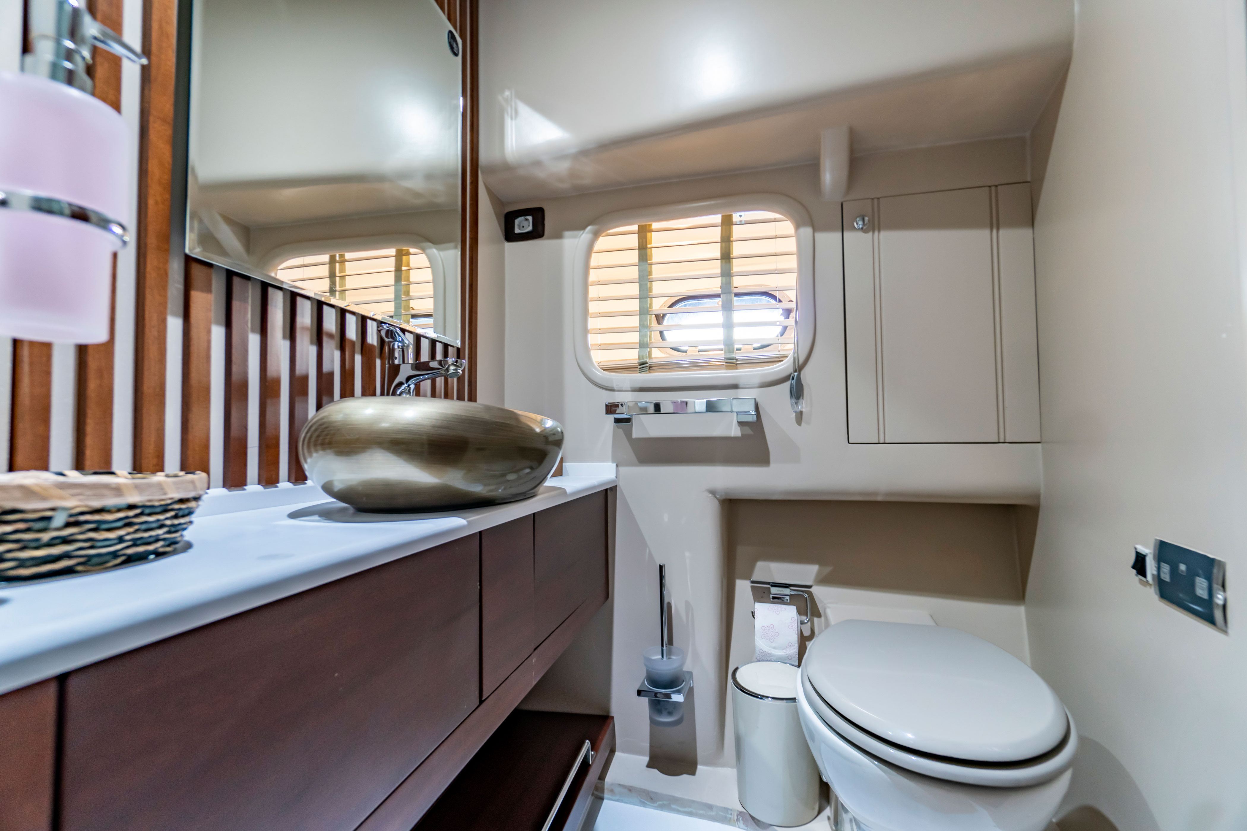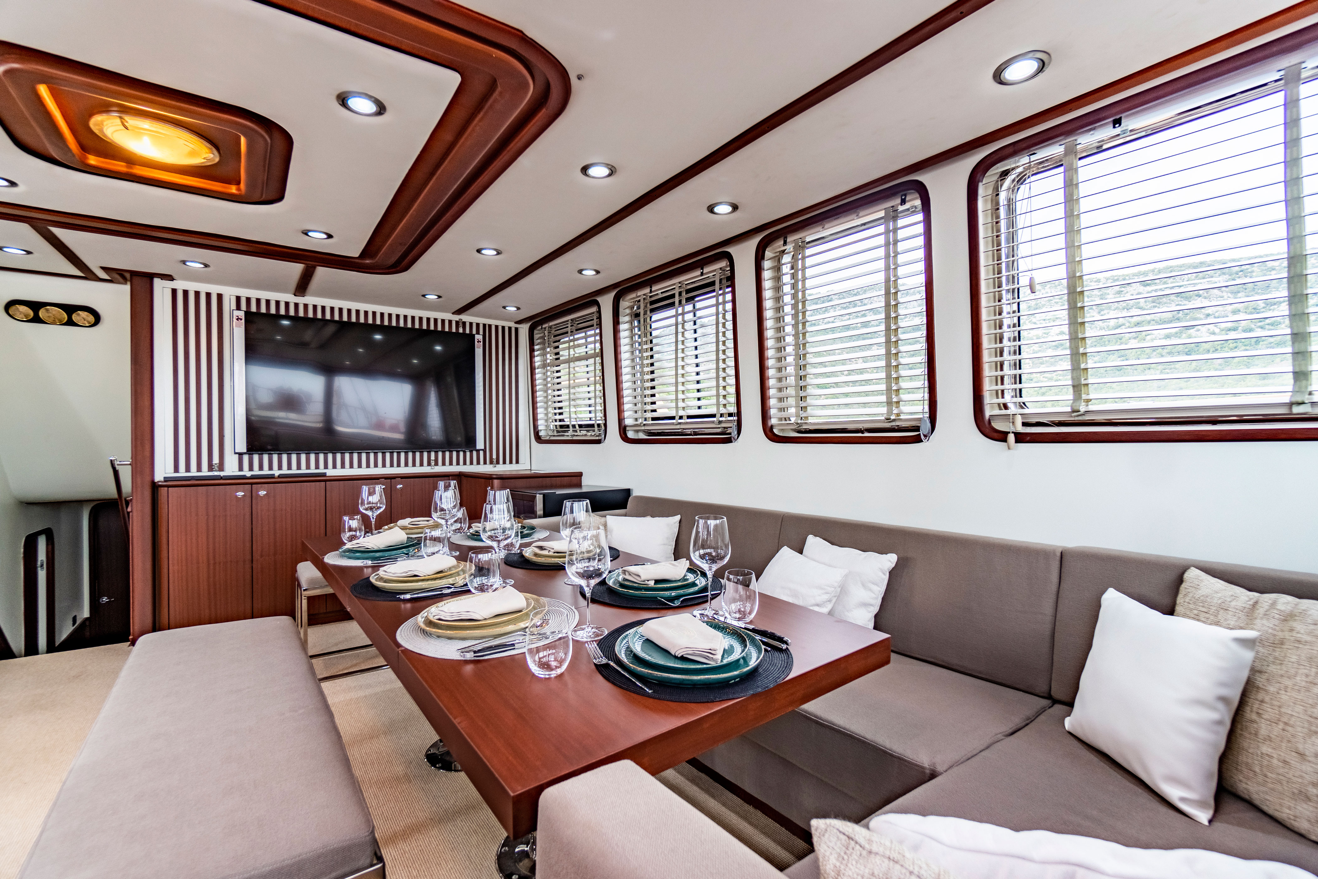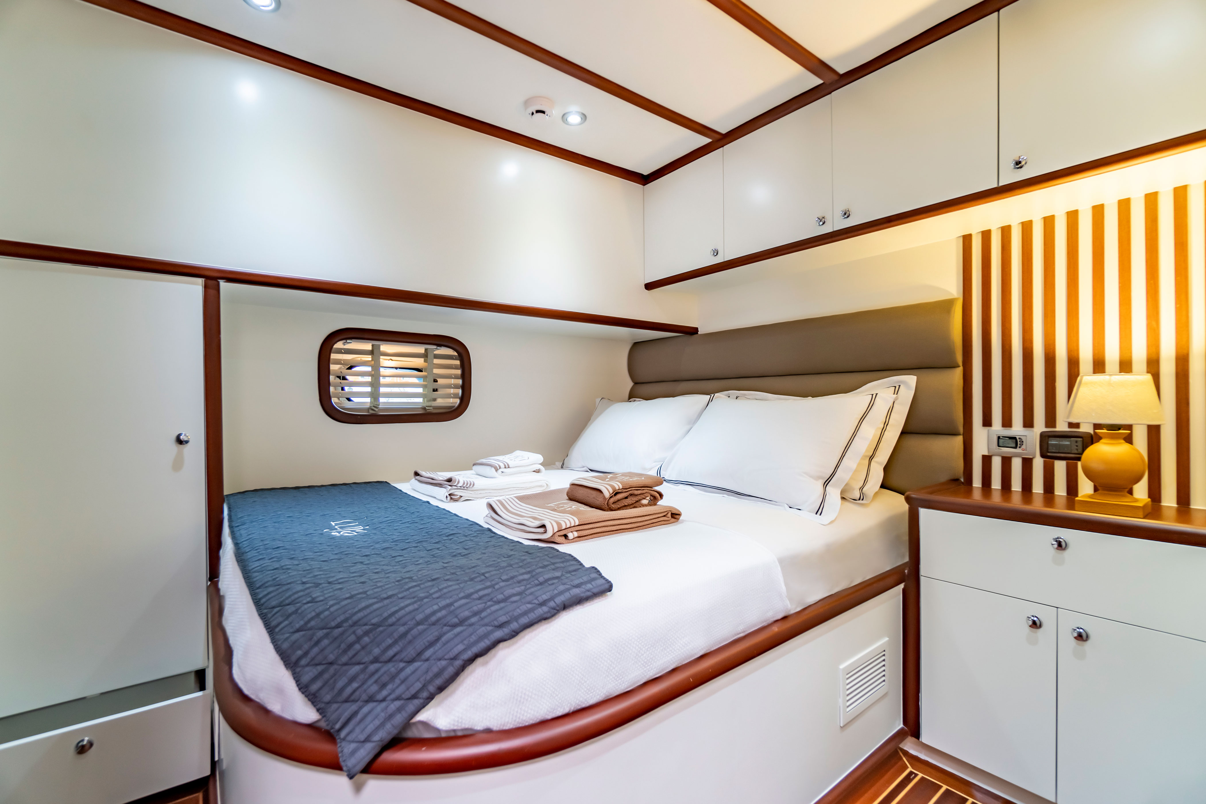 Our yacht features 4 stylish and comfortable cabins, including 2 Master Cabins and 2 Double Cabins, each equipped with its own shower, WC, and air conditioning. It is powered by 2 x 400hp Man engines and 2 x 22.5kW Onan generators.