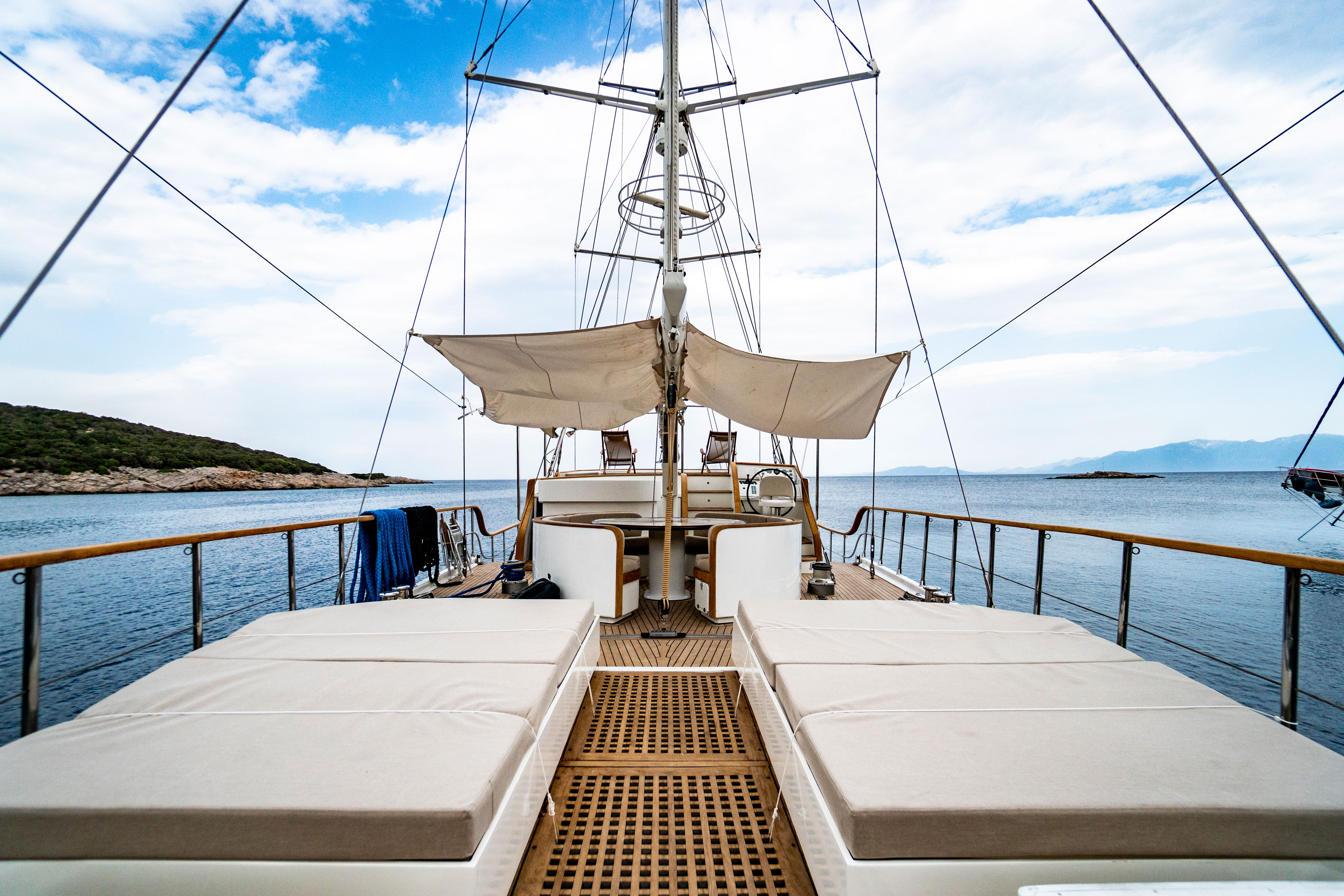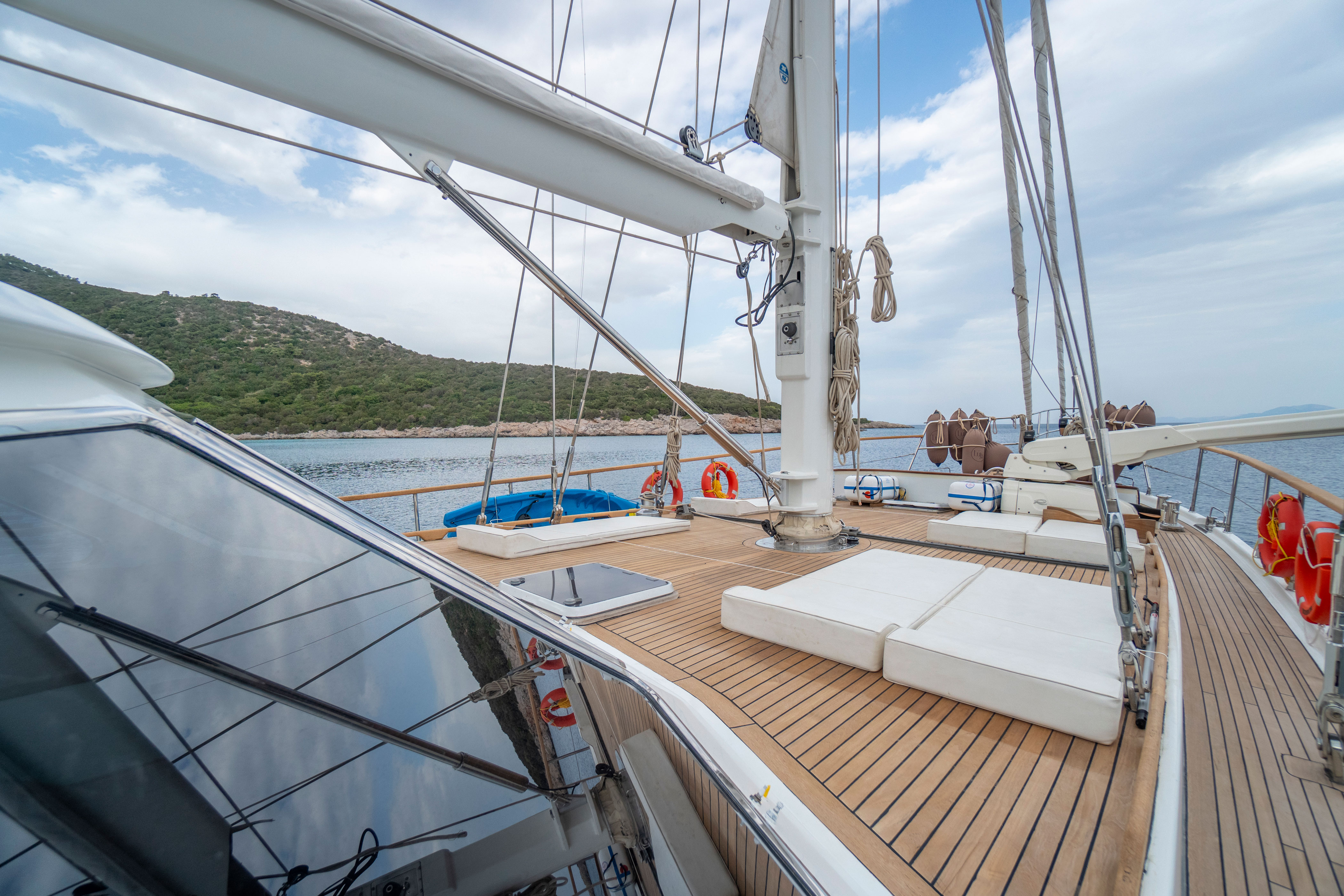 There are ample sunbathing cushions, chairs, and service sets for all guests. Offering comfort, luxury, and tranquility to our blue cruise guests, this yacht can reach speeds of up to 12 nautical miles per hour.
