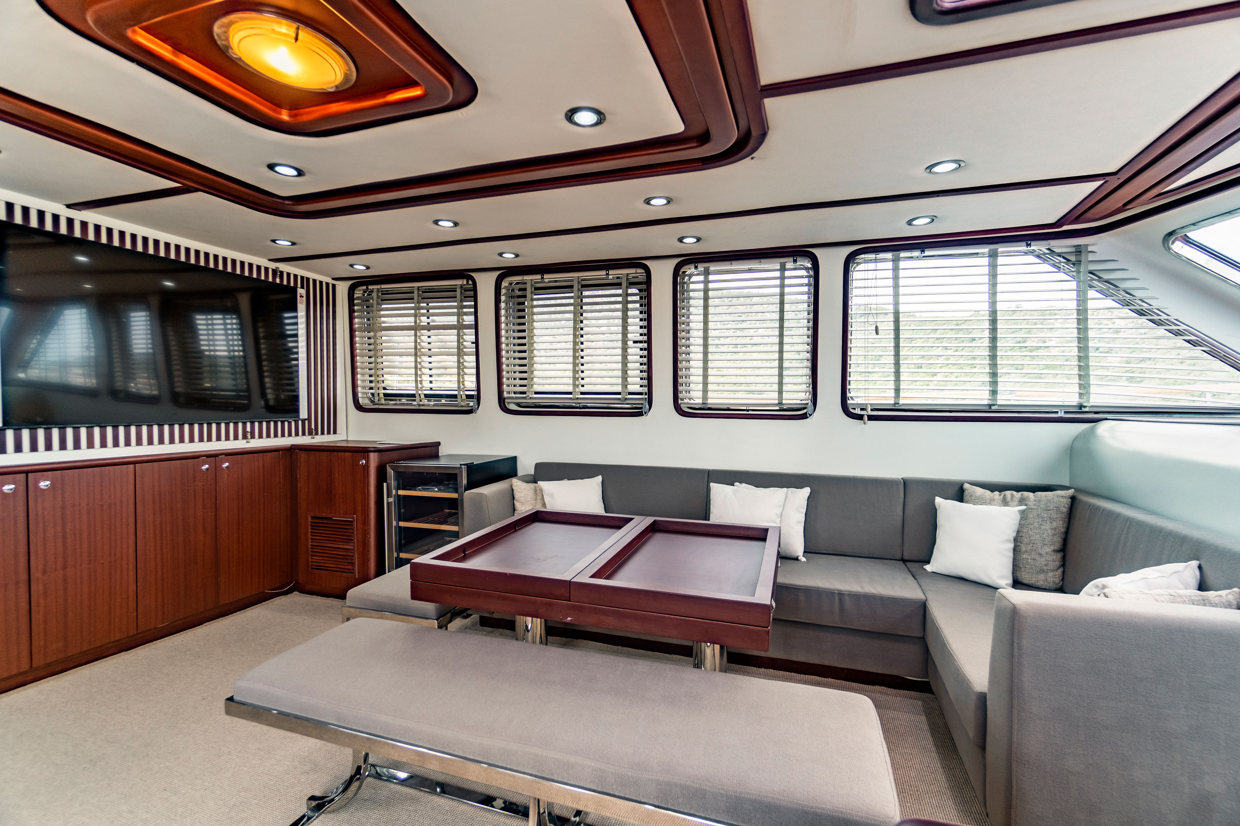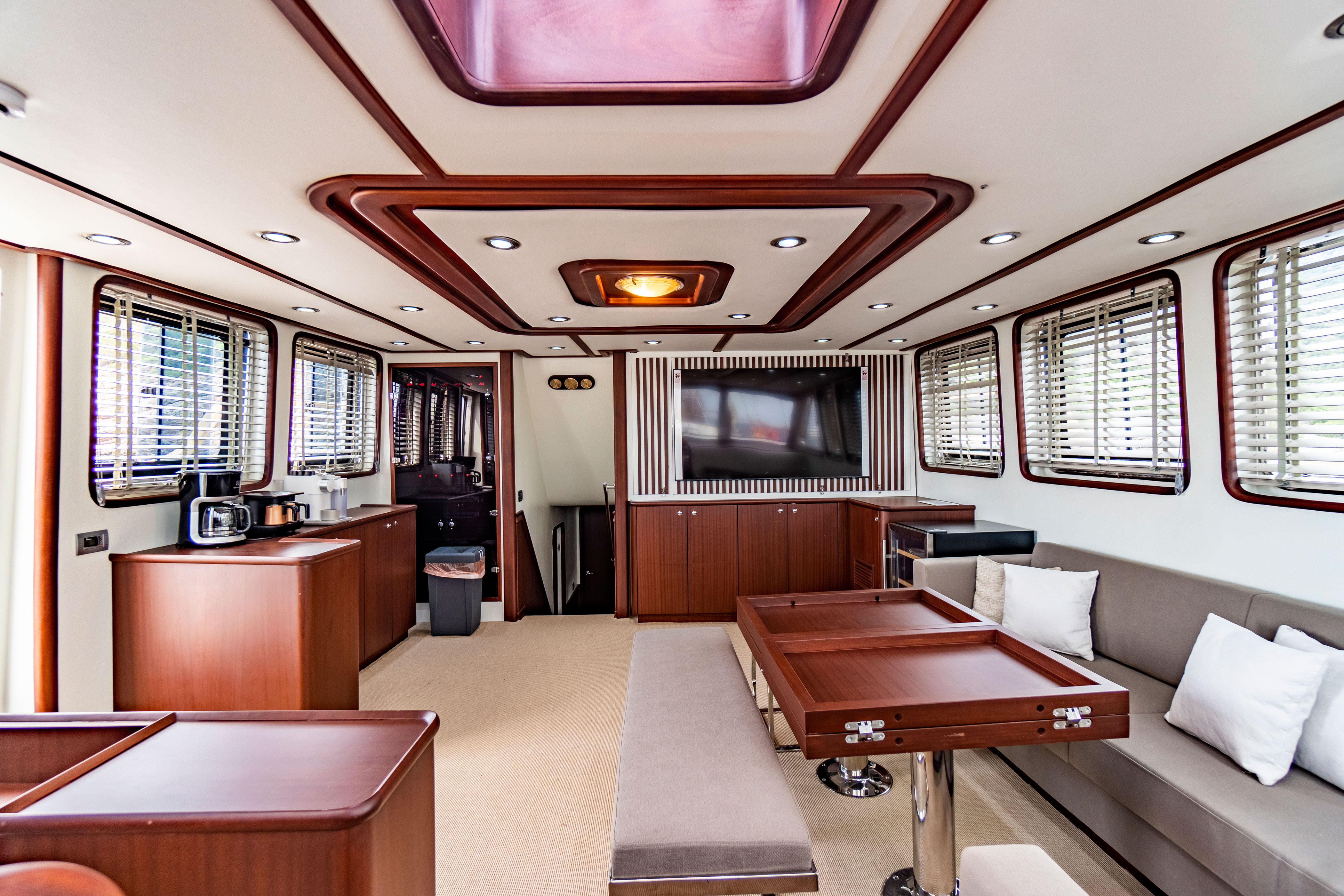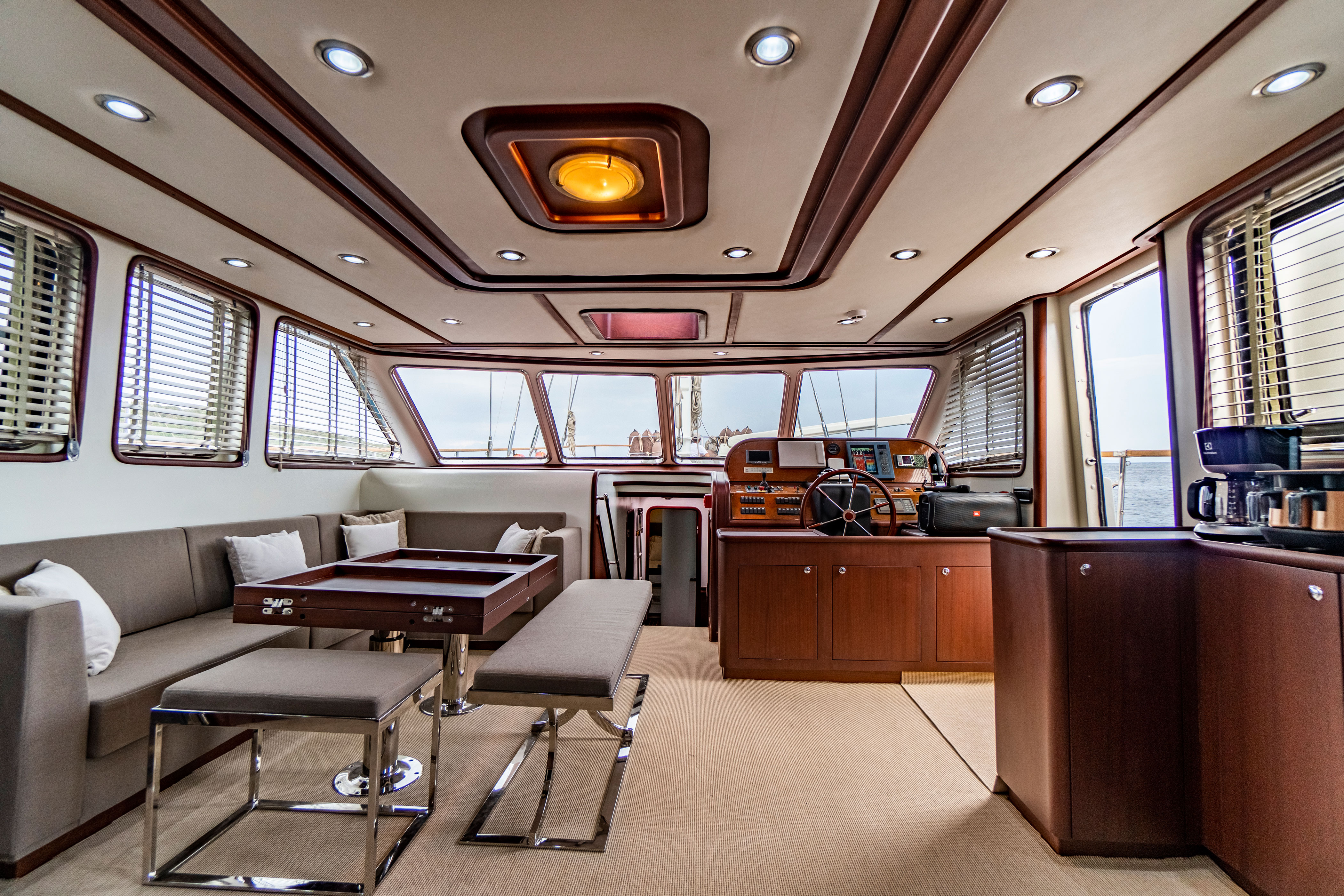 There are separate living areas for the crew, a fully equipped galley, indoor and outdoor dining areas, relaxation areas, and an American bar.