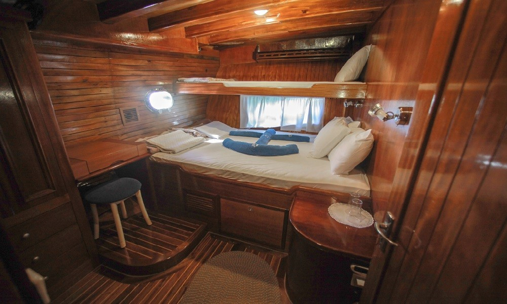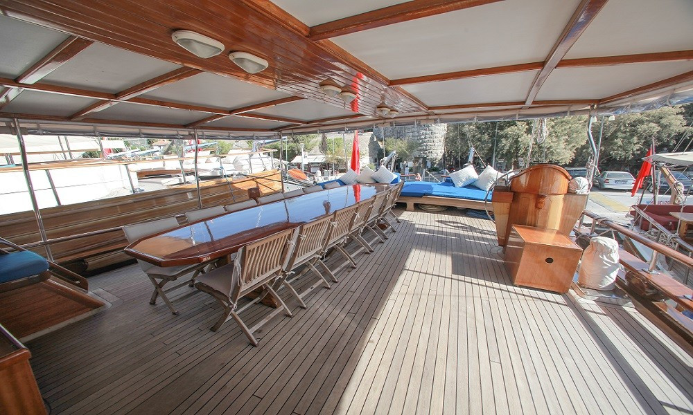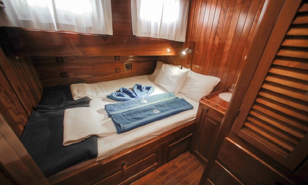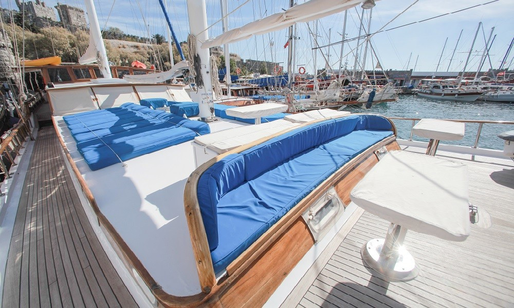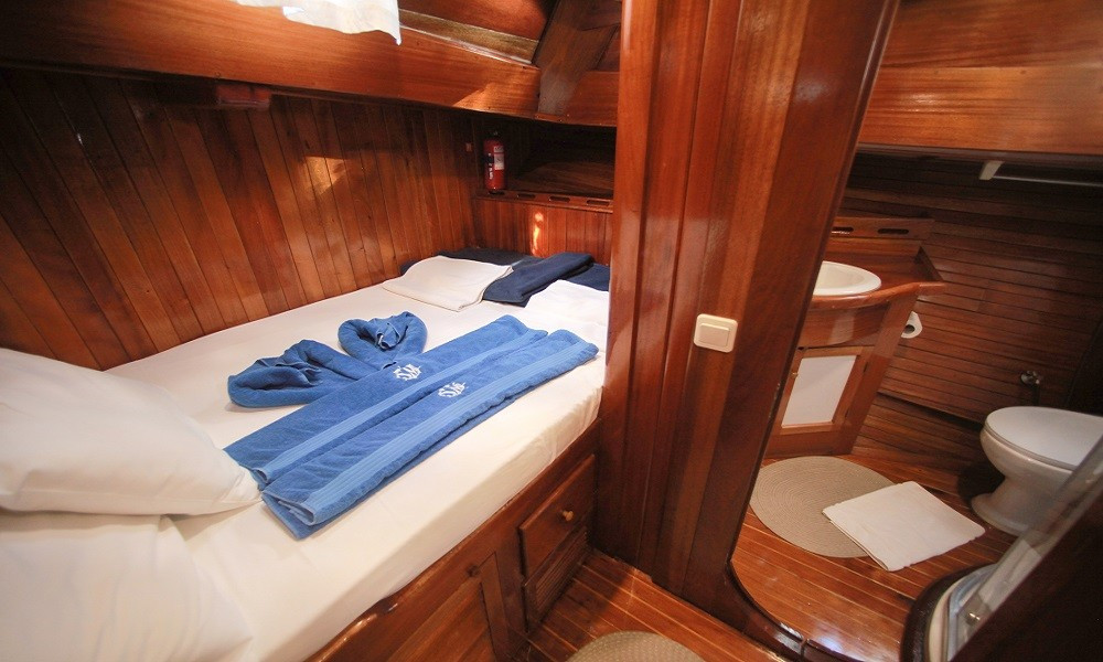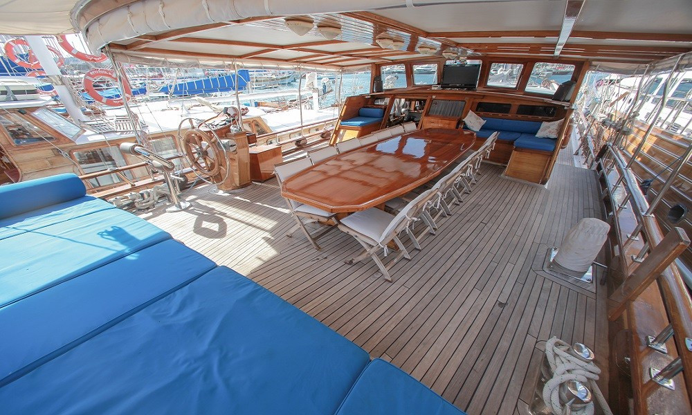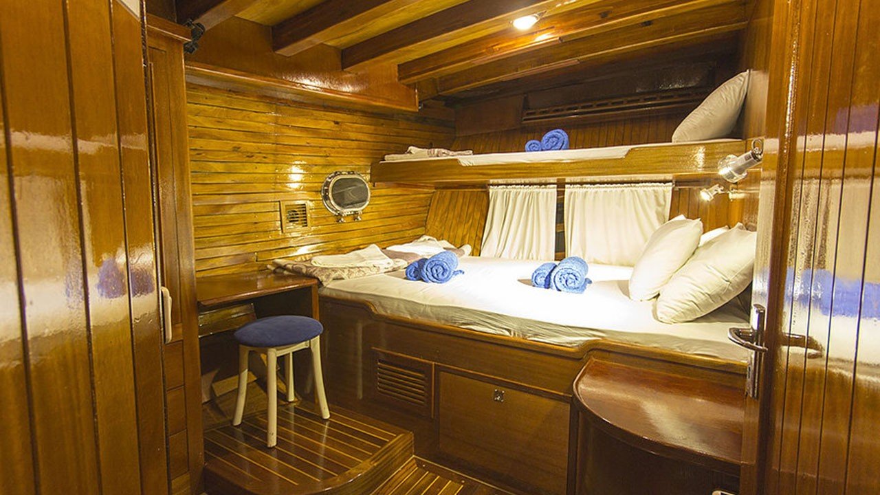 Gulet Sultan A, built in 1995 with a length of 28 meters and a beam of 7 meters, underwent a complete modern renovation in 2016, taking its current form. It accommodates 16 guests in a total of 8 cabins: 4 double cabins, 2 twin cabins, and 2 triple cabins. Our cabins are large, spacious, and modern, with air conditioning, shower, and restroom. Meals meticulously prepared in our fully equipped kitchen can be enjoyed on the aft deck or at elegant tables in the lounge. A music system, TV, and satellite channels are available for guests to enjoy, while the air conditioning, which adds to the comfort of the summer months, is always available for use. Additional onboard amenities include an ice machine, coffee machine, playing cards, backgammon, and okey. If you want to make the most of the blue seas, it's worth noting that the boat offers many advantages. Fishing equipment and diving gear are always available for your use. On the deck, there is a large cushioned seating area, a sunbathing area and sufficient sun cushions.